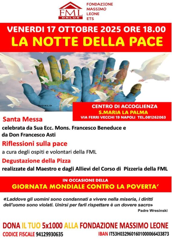 Una notte per incontrarsi, ascoltare e costruire insieme. La Notte della Pace per i Senza Dimora è un invito a condividere calore umano e dignità, perché nessuno resti solo. In occasione dell’evento, durante la Santa Messa, ricorderemo insieme nella preghiera il dott. Angelo Fuccio, storico operatore volontario della FML che tanto ha realizzato e costruito […]