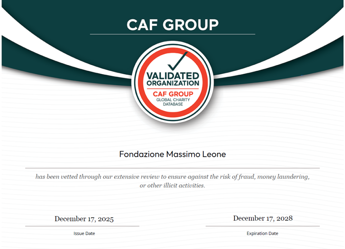 Fondazione Massimo Leone ottiene un importante riconoscimento internazionale Siamo lieti di annunciare che la Fondazione Massimo Leone ha ricevuto un prestigioso riconoscimento internazionale attraverso il certificato di validazione rilasciato da CAF Group – Global Charity Database. Questo importante traguardo rappresenta il risultato di un rigoroso processo di verifica volto a garantire i più alti standard […]