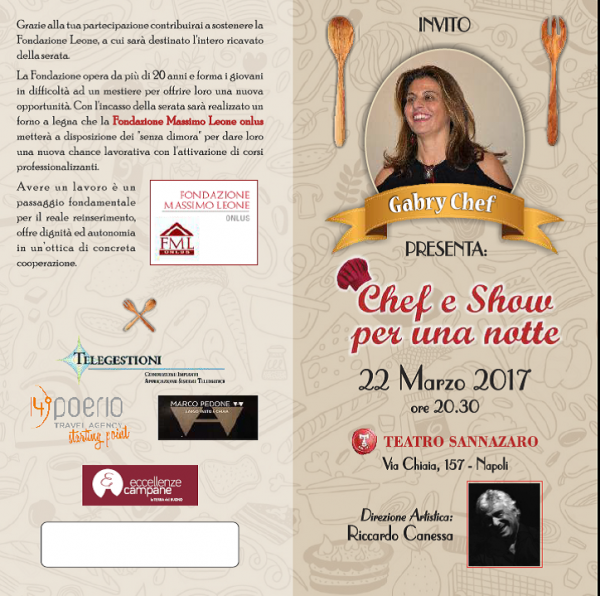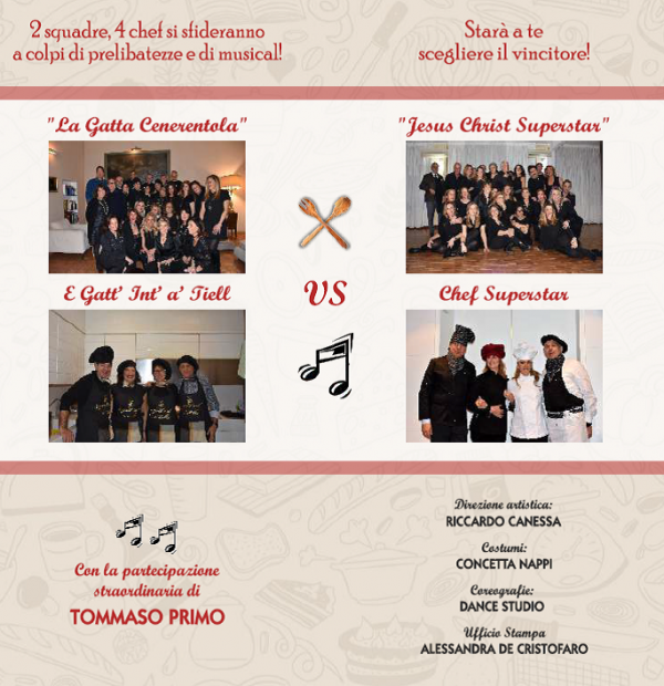 Fornelli, balli e canzoni per gli habitué di Gabry Chef, la “singolar tenzone” tra professionisti ed imprenditori che per mesi si preparano alla festa che Gabriella Fabbrocini organizza per gli amici. Ospitata dal teatro Sannazaro trasformato da Lara Sansone in un maxi salotto, la serata ha visto infatti in gara le formazioni di Chef Superstar contro E Gatt’ int’ a Tiella, che si sono esibite innanzitutto in un simil master chef giudicato da Ottavio Lucarelli, Stefano Albamonte, Armando Sposito e Pietro Parisi con i “cuochi” Roberto Ajello, Gianluigi Forquet, Antonella Nardone, Fabrizio Basilone, Francesco Todisco, Francesca Schiavo, Vincenzo De Maio, Anna Cesare . A seguire, coordinati dal regista Riccardo Canessa con la supervisione dei maestri Raffaele Esposito e Valentina Russo, le performance teatrali e di ballo sulle note de La Gatta Cenerentola che hanno consacrato alle scene, tra gli altri, degli strepitosi Gabriele Gava, Giovanni Betta, Luca Ramaglia, Massimo Gentile e Francesco Di Palma. Last but non least, quindi, gli interpreti di Jesus Christ Superstar tra cui l’Erode Francesco De Giovanni e l’insolito Gesù Renata Piccinino, giudicati come i primi da una giuria tecnica di cui facevano parte anche Guglielmo Mirra e Giovanni Iodice. Una serata decisamente diversa dal solito insomma quella presentata da Monica Leoffredi ed animata da Tommaso Primo, realizzata anche grazie al supporto della Bcc rappresentata da Amedeo Manzo ed il cui ricavato sarà devoluto alla Fondazione Massimo Leone Onlus guidata da Carlo Antonio Leone per l’acquisto di un forno a legna che consenta l’attivazione di corsi per pizzaiolo.